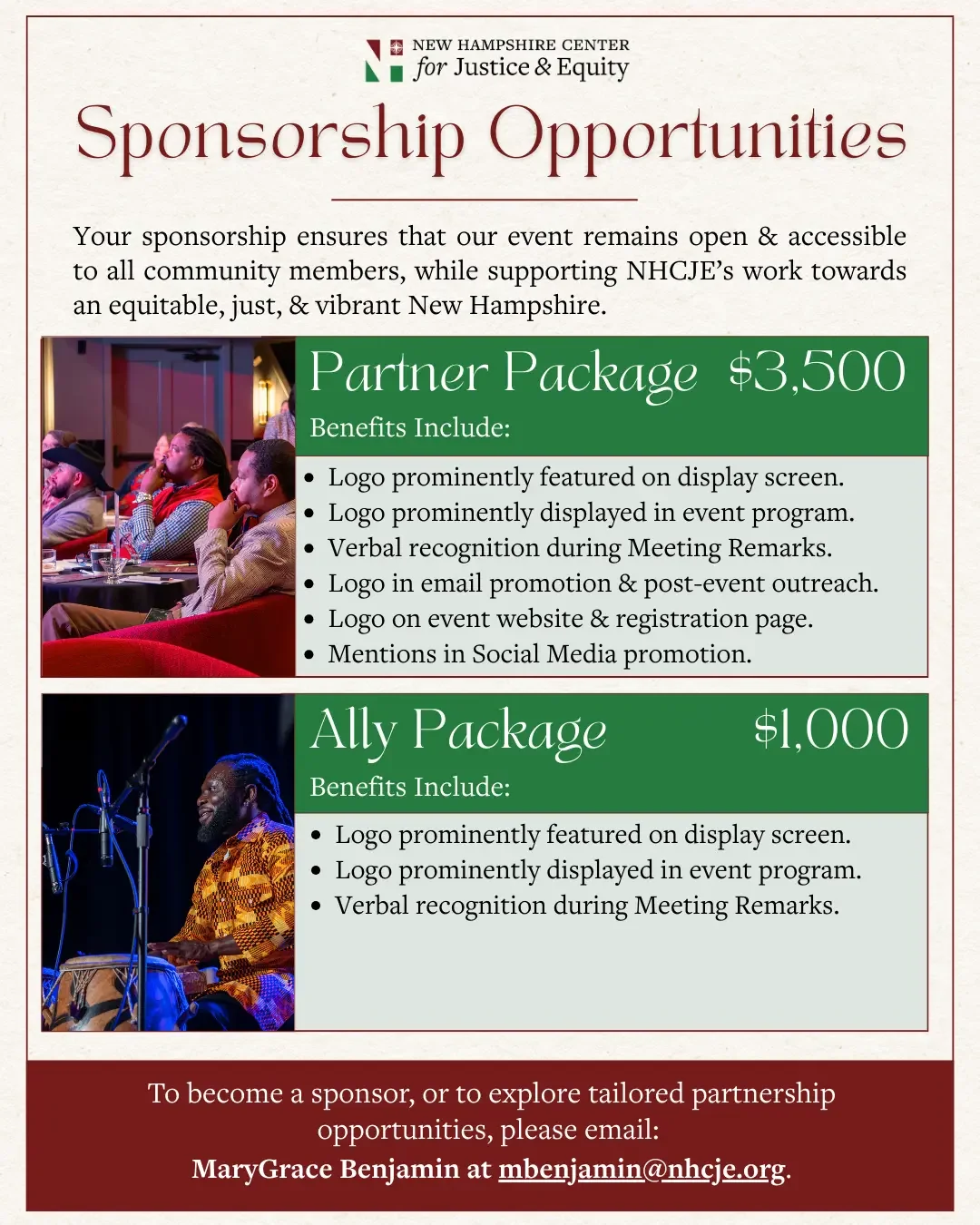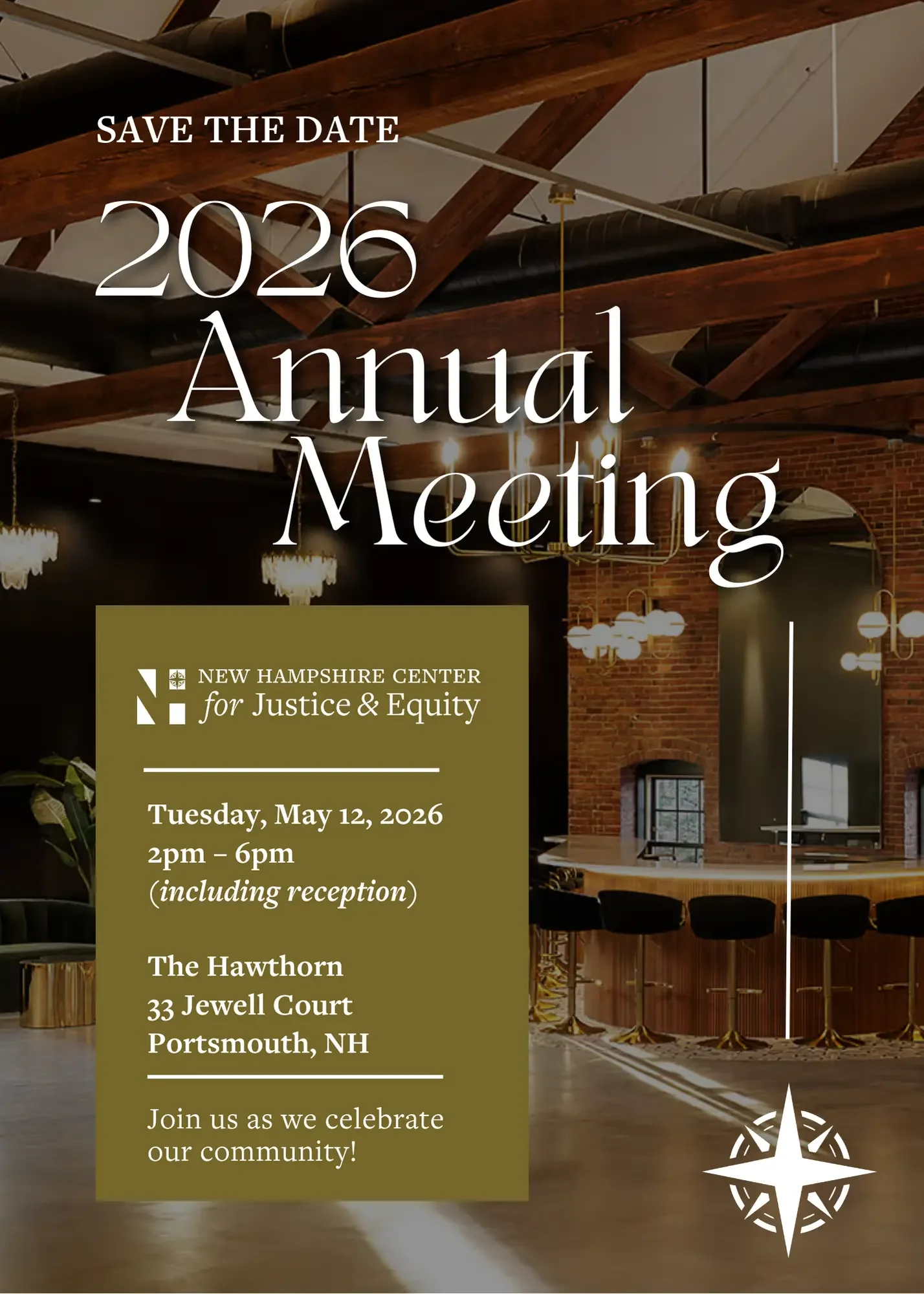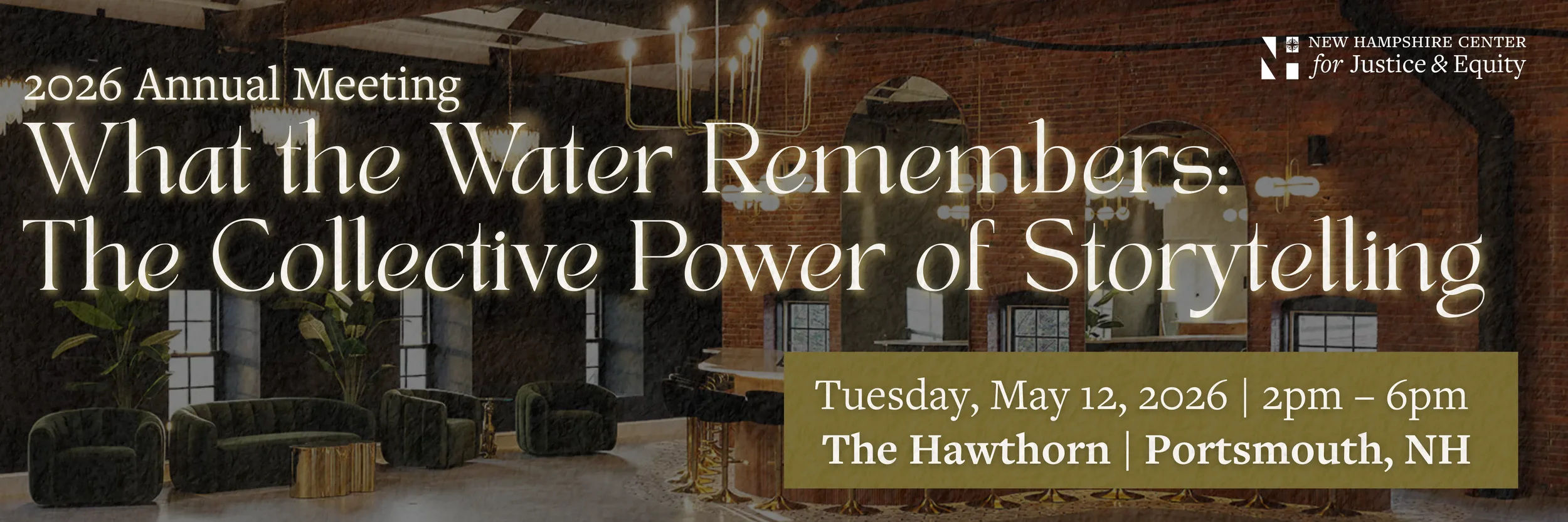 Save the Date 2026 Annual MeetingWhat the Water Remembers: The Collective Power of StorytellingDATE: Tuesday, May 12, 2026 TIME: 2pm — 6pm (including networking reception) LOCATION: The Hawthorn, 33 Jewell Court, Portsmouth NH Sponsorship Opportunities Interested in sponsoring this year’s Annual Meeting? Email MaryGrace (MG) Benjamin at mbenjamin@nhcje.org. Download the Sponsorship Package. Thank You to Our Current Sponsors! Partners Allies
