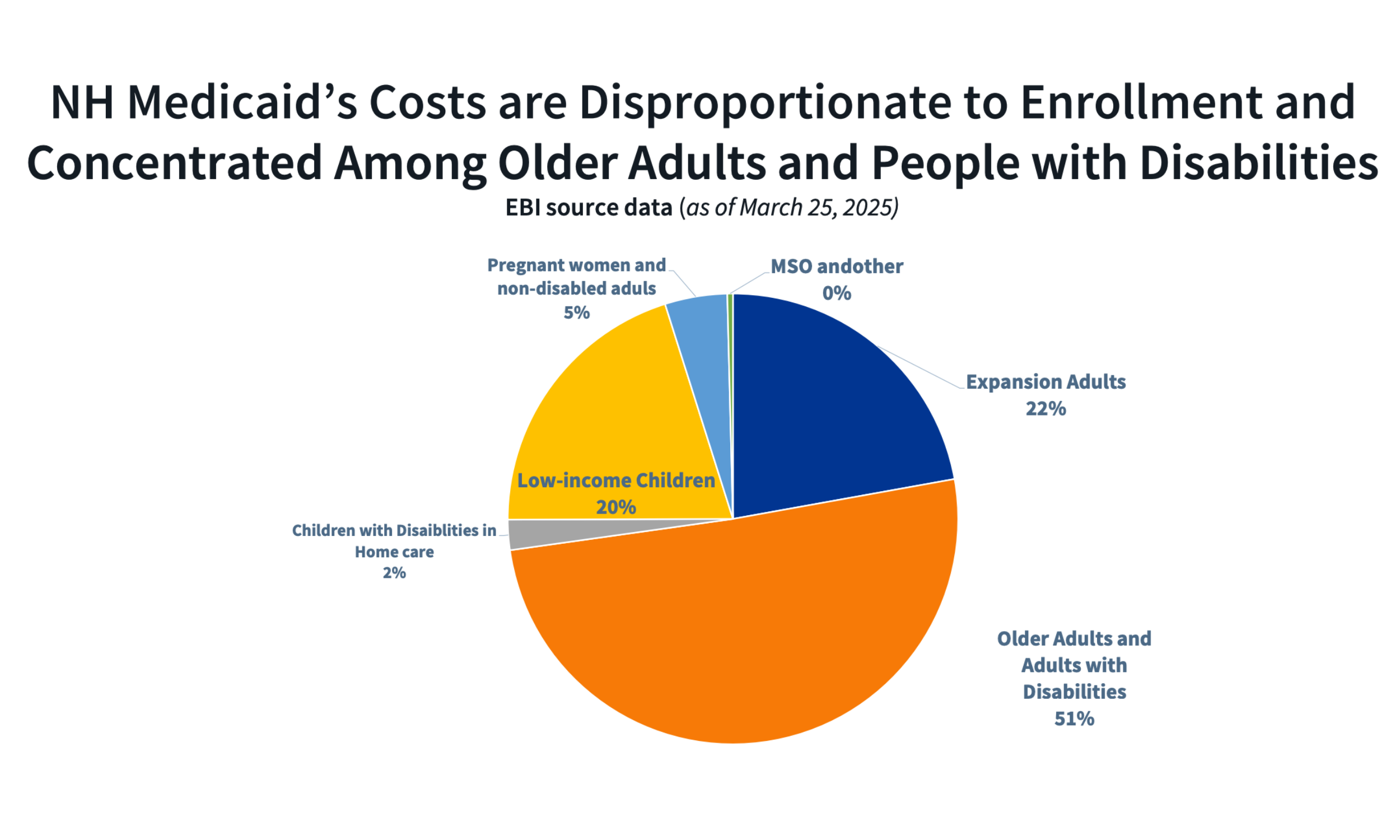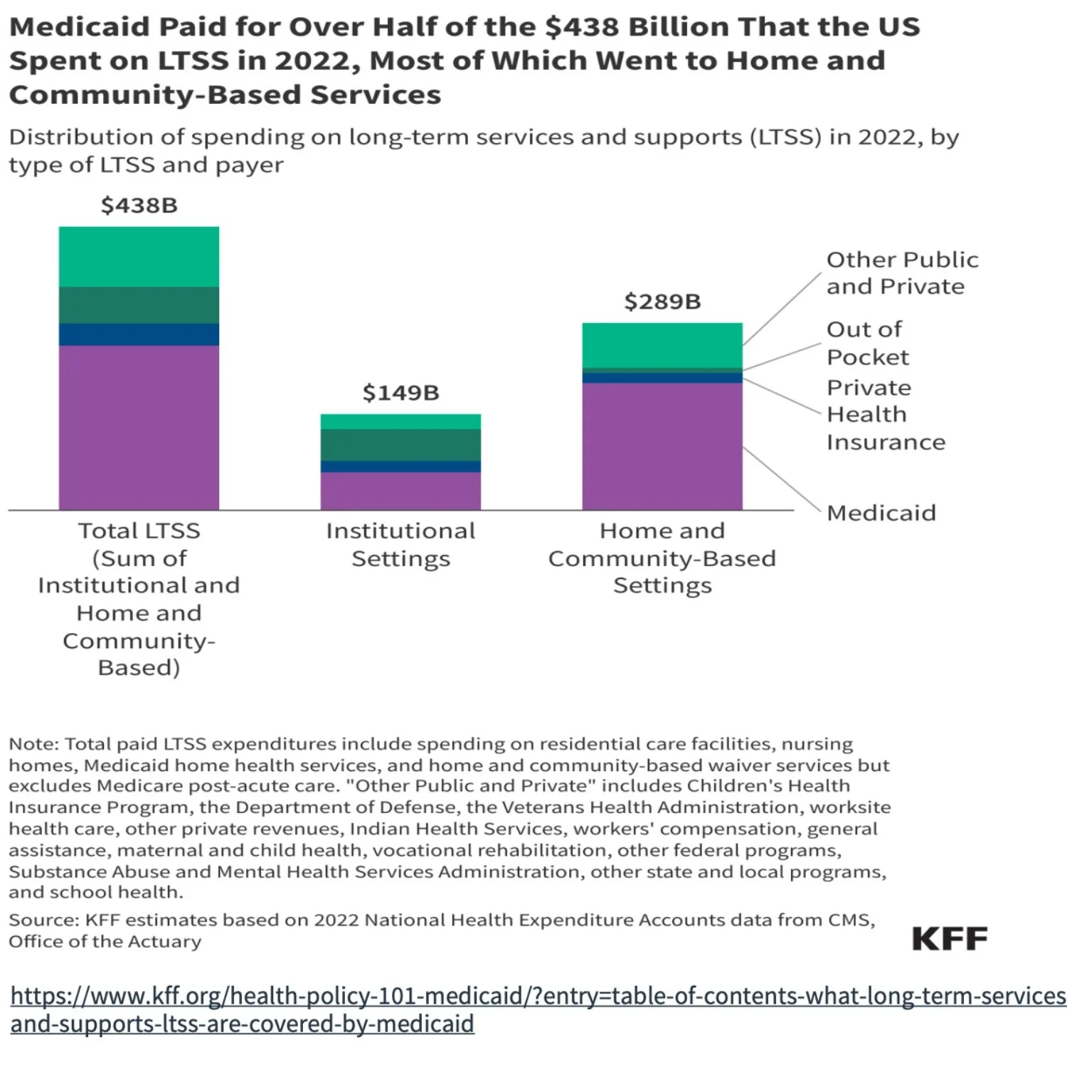 Nationwide, Medicaid is a particularly important source of coverage for LTSS, which include nursing home and residential care. According to the Kaiser Family Foundation, Medicaid was the payer for more than half of LTSS services in the US in 2022. In New Hampshire, 5 out of 8 nursing home residents are covered by Medicaid.