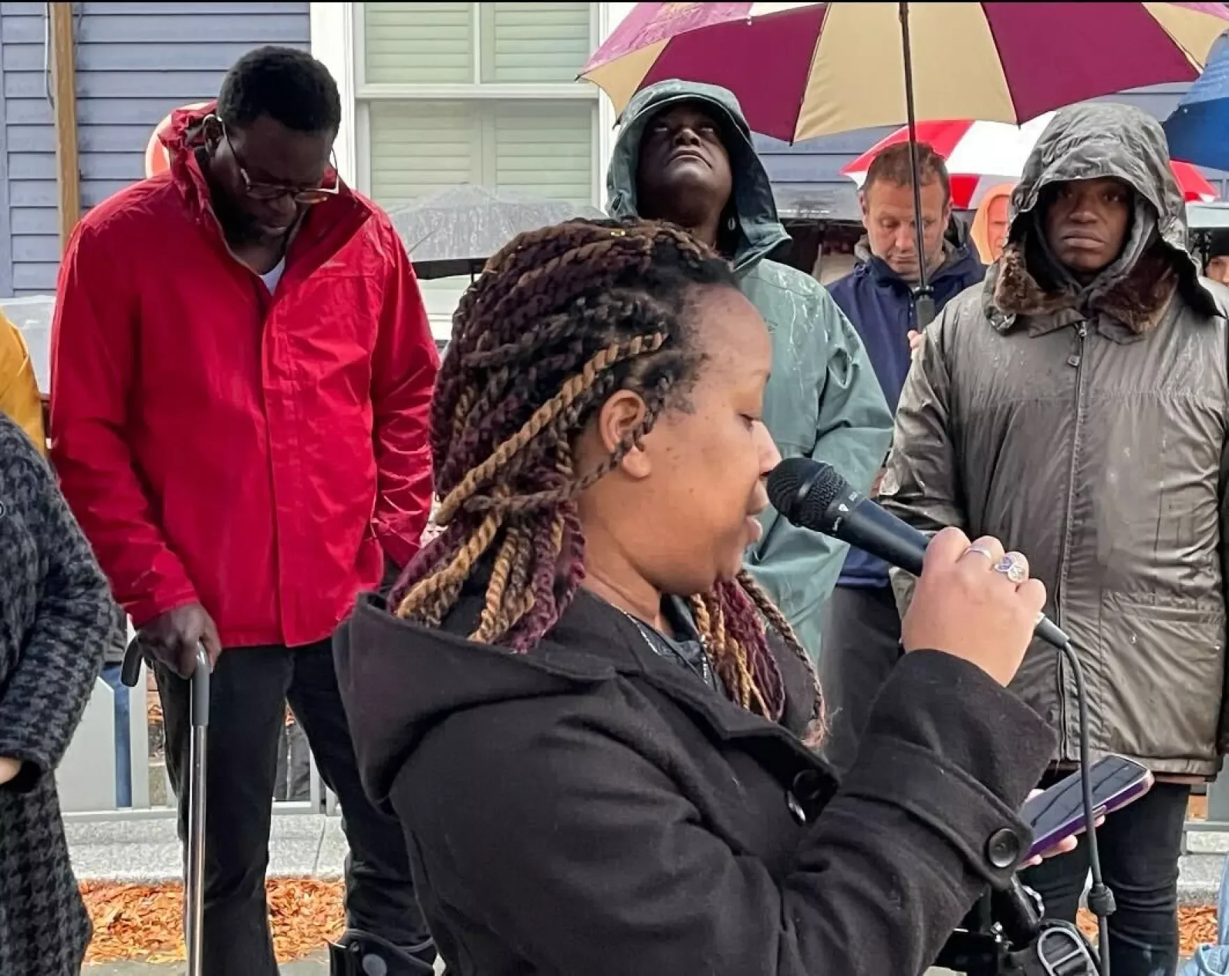 Standing on the site of Portsmouth’s African Burying Ground memorial in a cold drizzle, dozens of people gathered Sunday to protest and call attention to a recent alleged assault against a Black resident of the city.