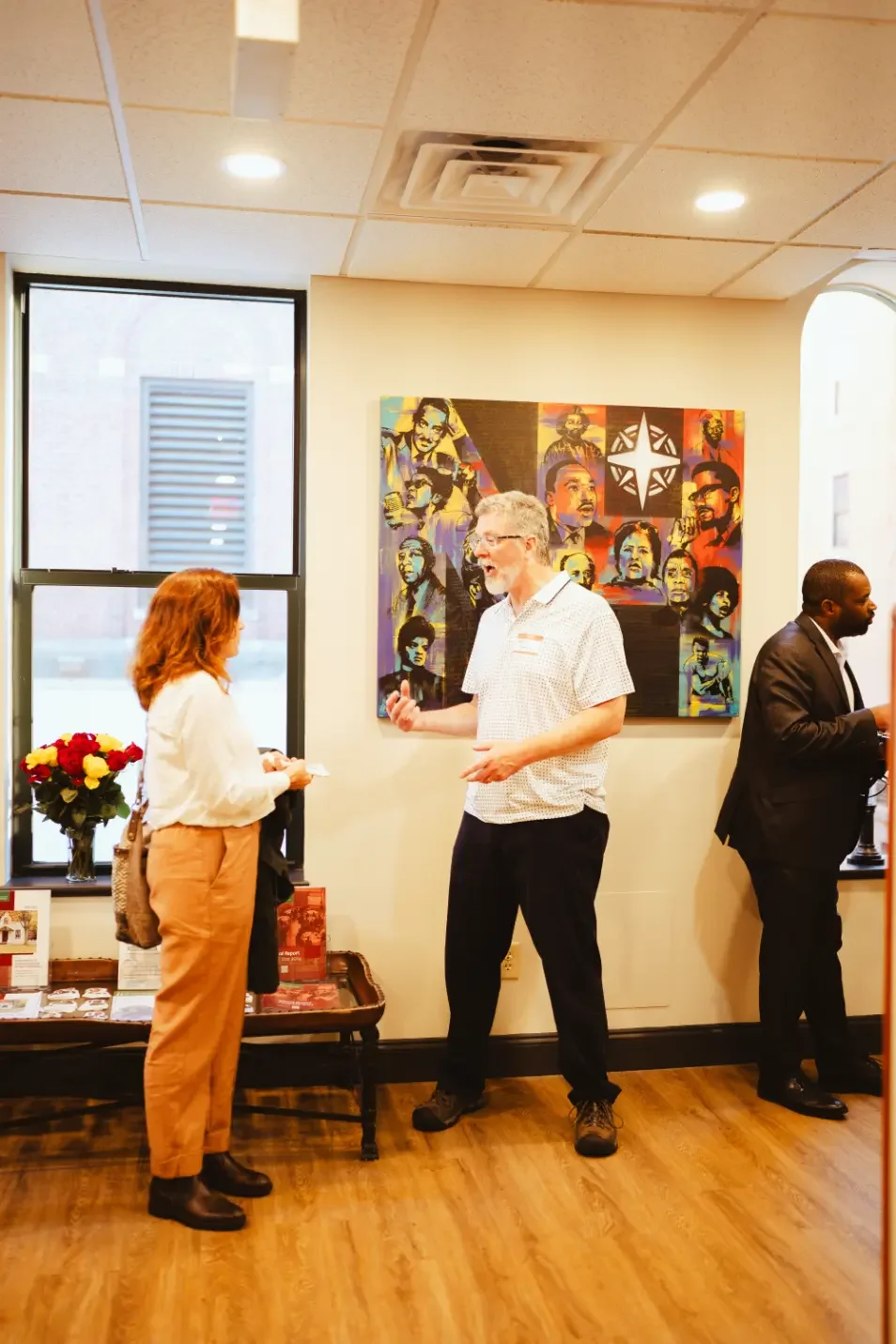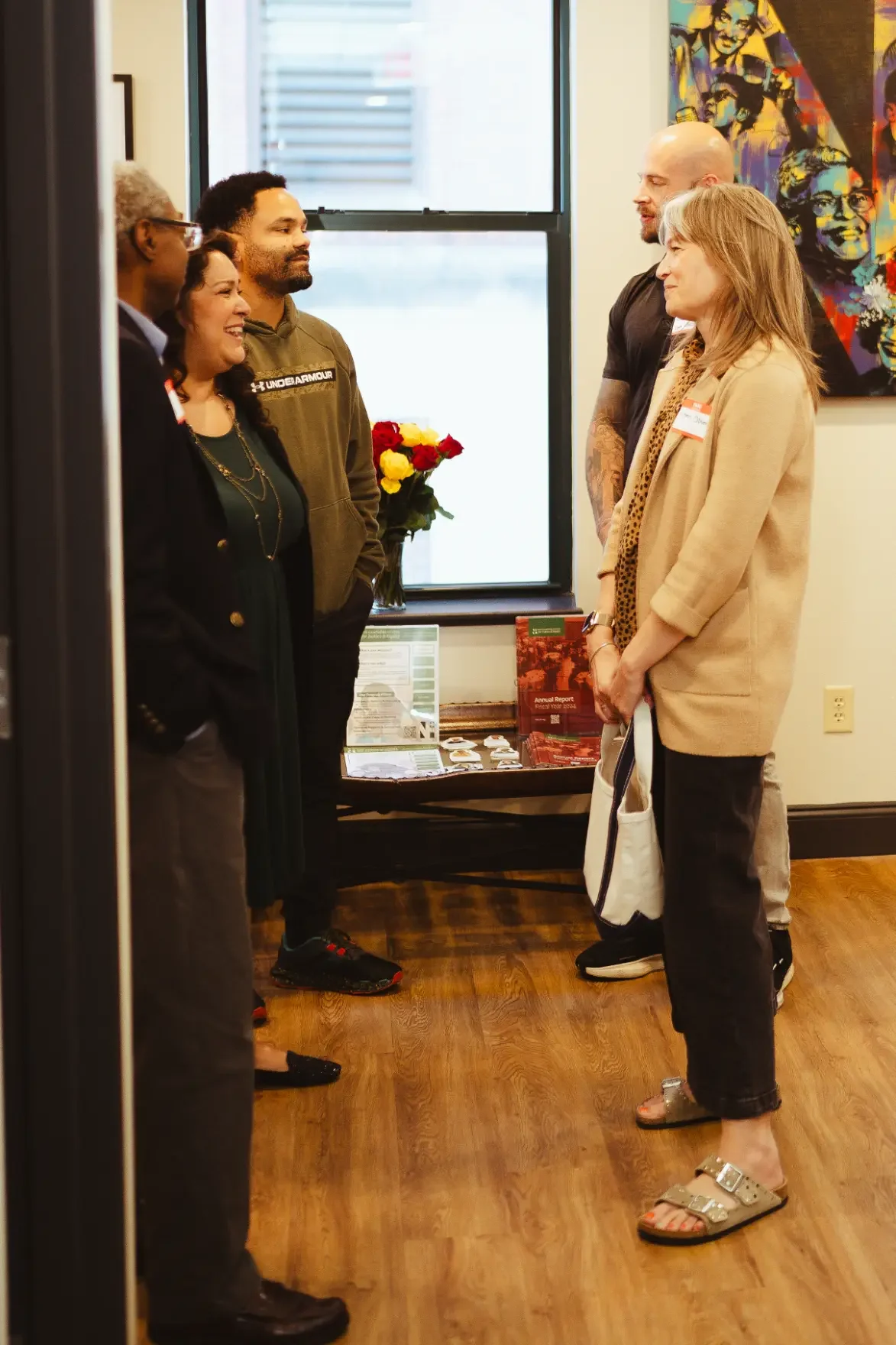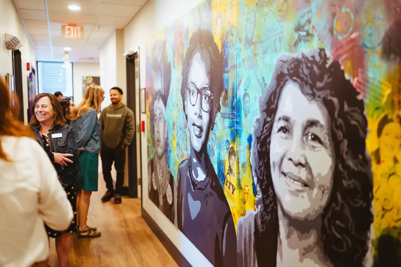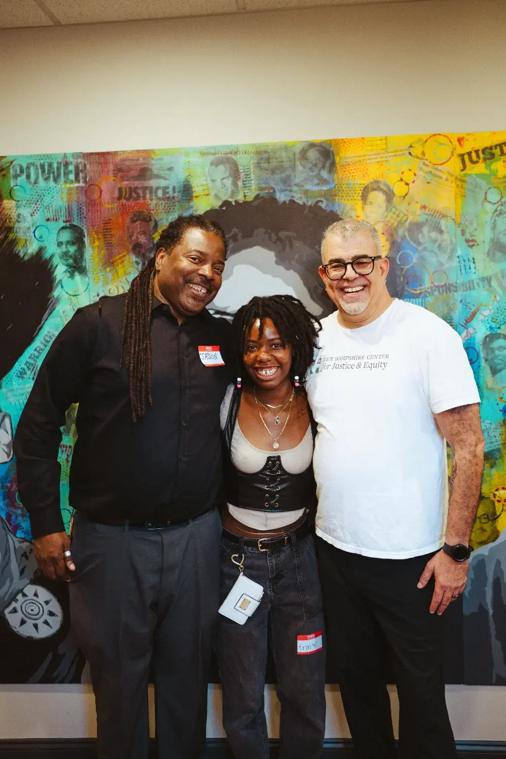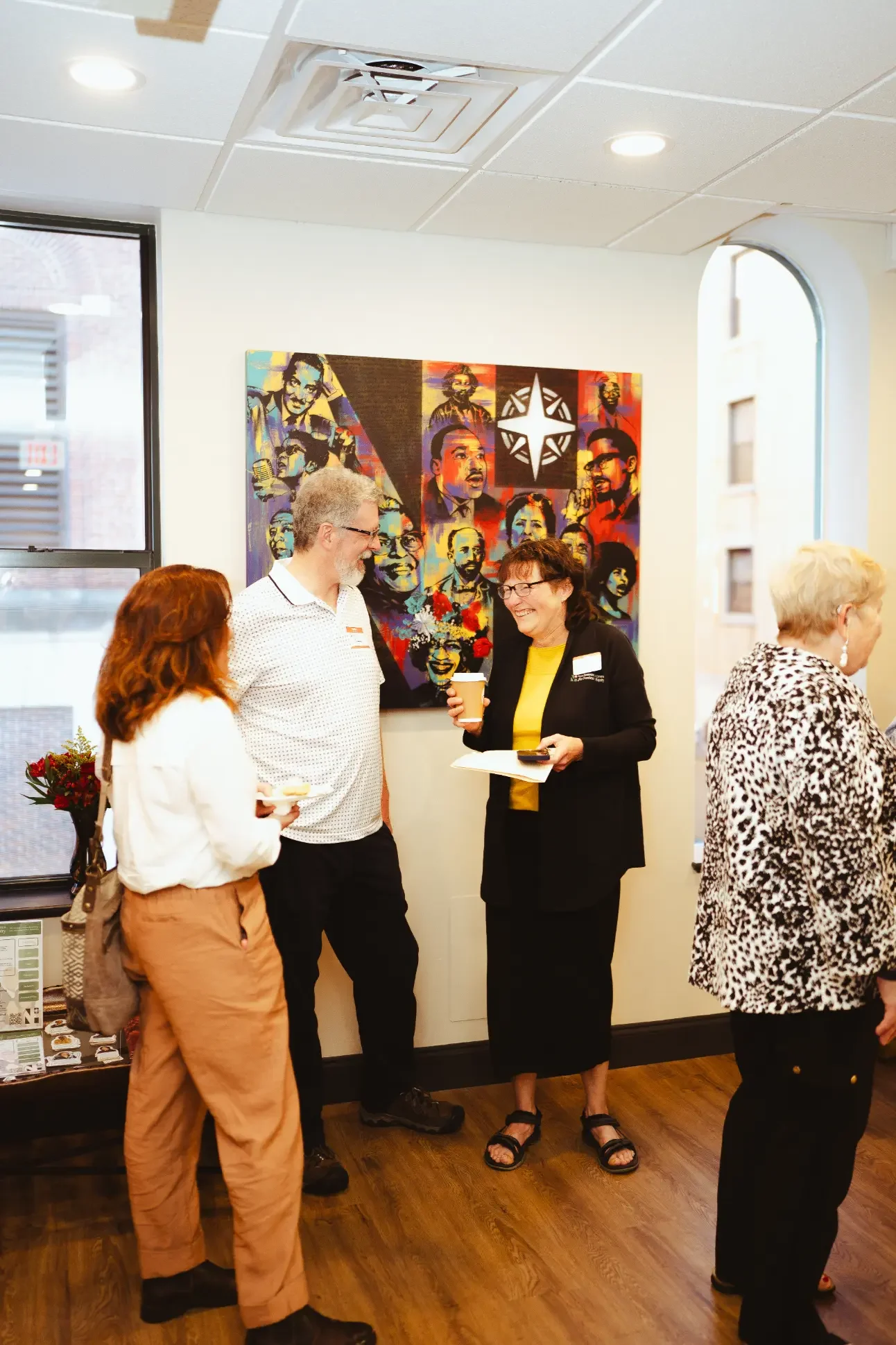 On October 8th, 2025, NHCJE hosted an Open House, to welcome our fellow community neighbors, allies, and colleagues to our new office space in downtown Manchester. The Open House featured an unveiling of a mural created by Positive Street Art for the NHCJE office.