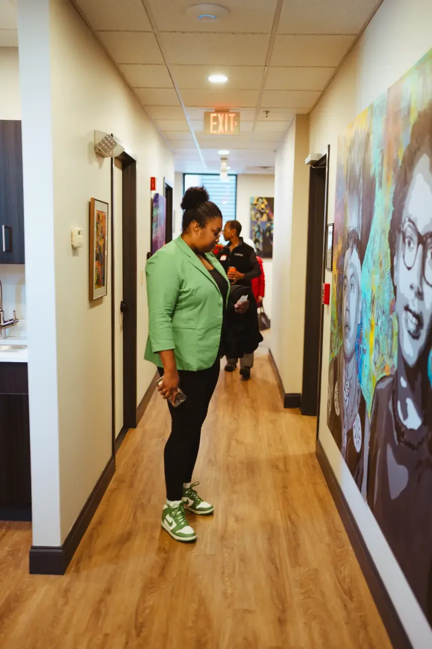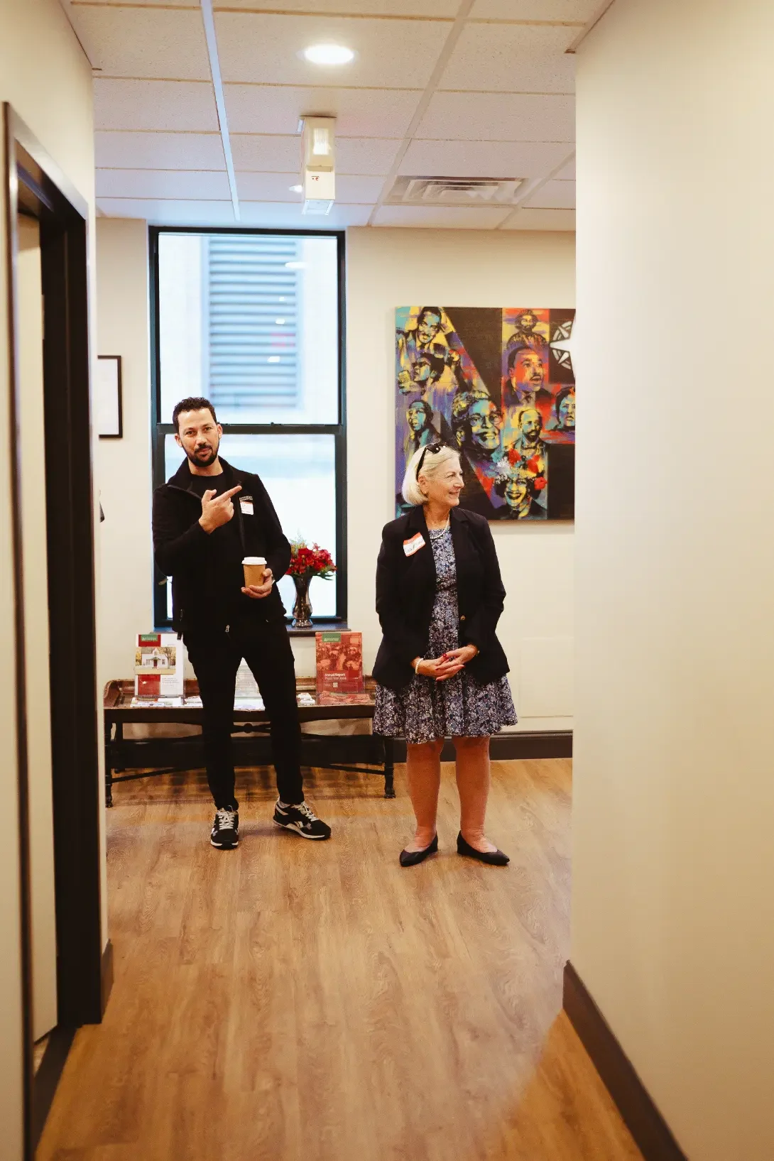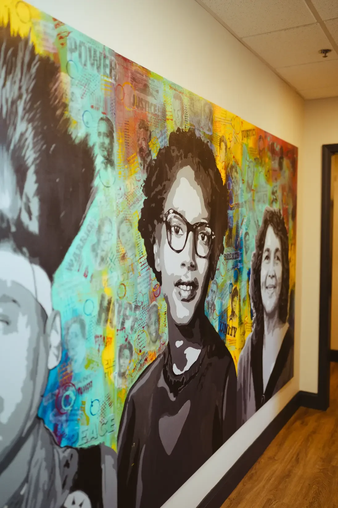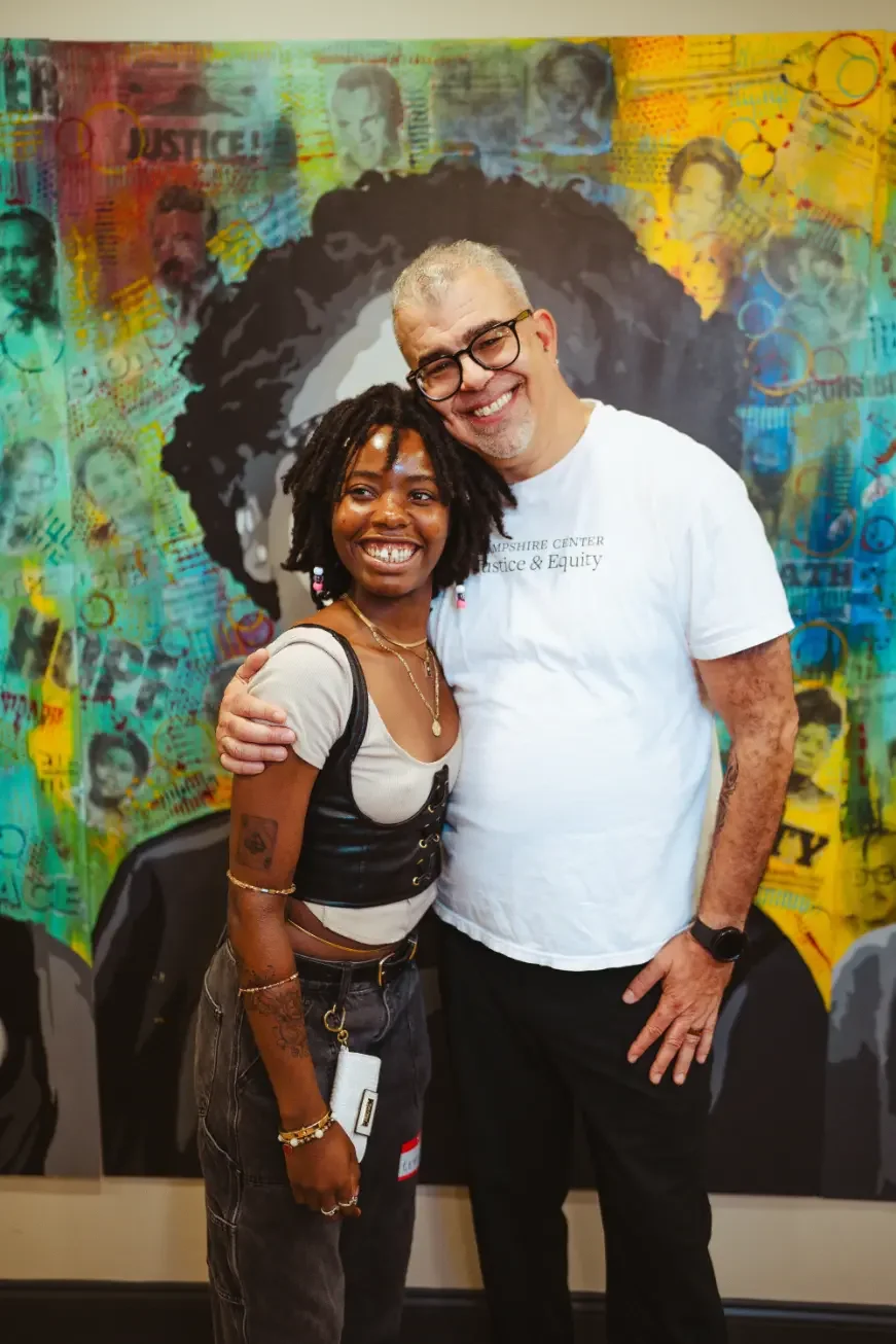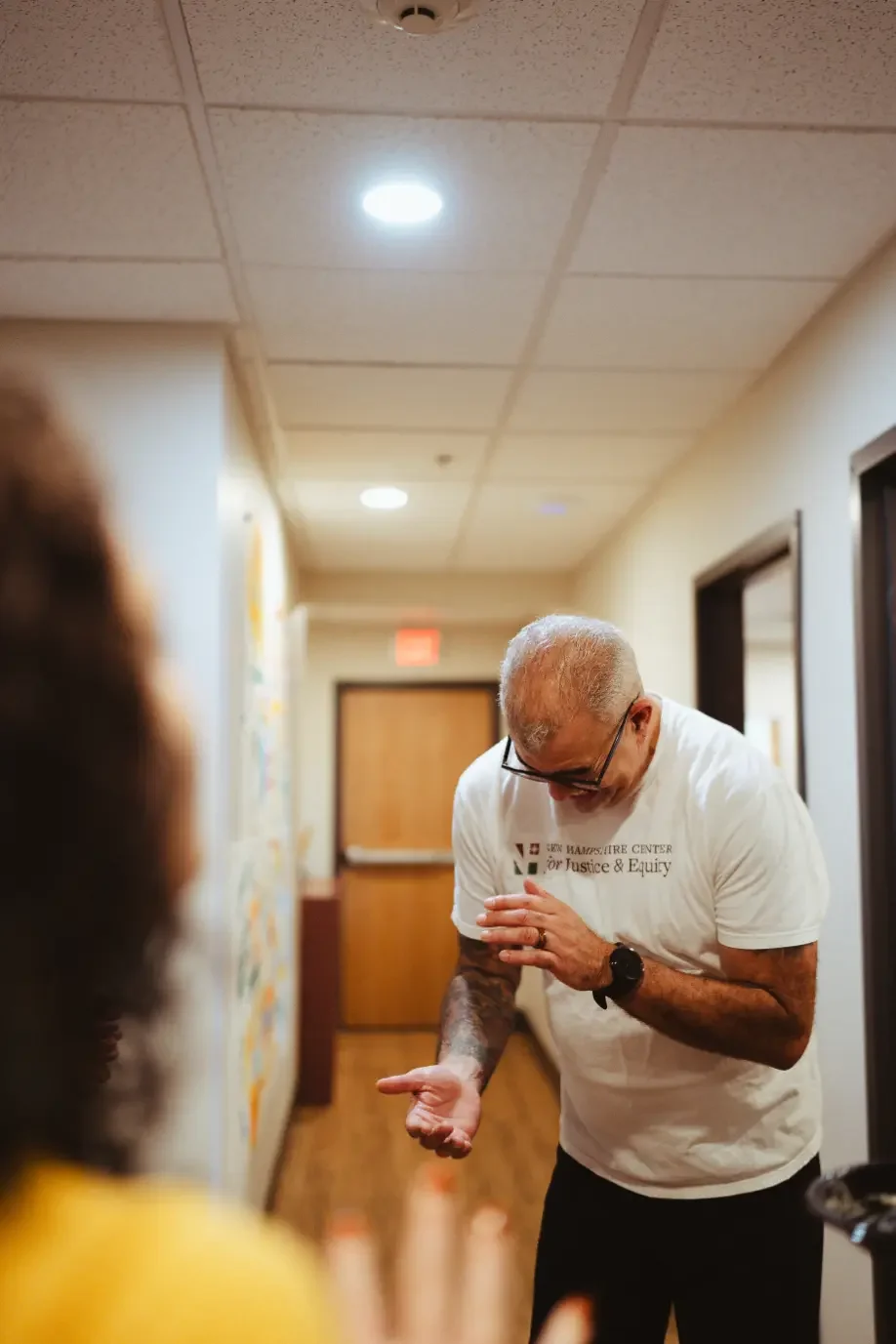 On October 8th, 2025, NHCJE hosted an Open House, to welcome our fellow community neighbors, allies, and colleagues to our new office space in downtown Manchester. The Open House featured an unveiling of a mural created by Positive Street Art for the NHCJE office.